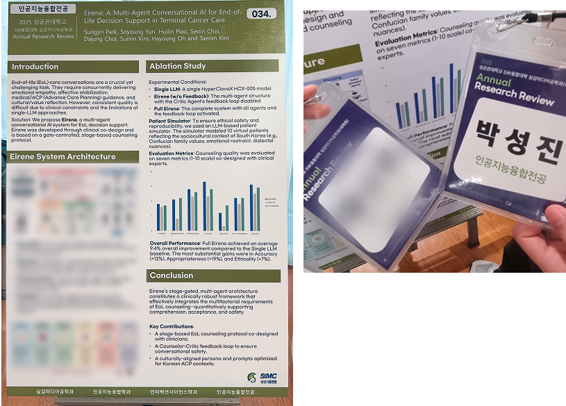 1년동안 연구실에서 학부연구생을 하며 연구 논문을 작성했다. 운이 좋게 삼성서울병원과 협업하는 기회를 얻어 말기 암 환자를 위한 챗봇 서비스를 개발했다. 위에서 말했던 풀스택 역량 덕분에 기능 구현은 수월했다. 하지만 연구 경험은 없었기에 논문을 어떻게 구성해야 하고, 연구 주제는 어떻게 잡아야 하는지 전혀 몰랐다. 그래도 행운인 건 정말 좋은 팀원들을 만나 1년 동안 많이 배울 수 있었다. 선행 연구를 정리하고, Research Question을 도출하고, 실험을 설계하고, 글로 잘 풀어내는 방법까지 연구에 필요한 기본 역량을 어깨너머로 배웠다. 게다가 사람 대 사람으로서도 본받을 점이 많은 팀원들이었기에 여러모로 감사한 시간이었다. 아직은 1년차라 스스로 부족하다고 느끼는 부분도 많지만, 앞으로 어떤 역량을 키워나가야 할지 조금은 감이 잡혔다.