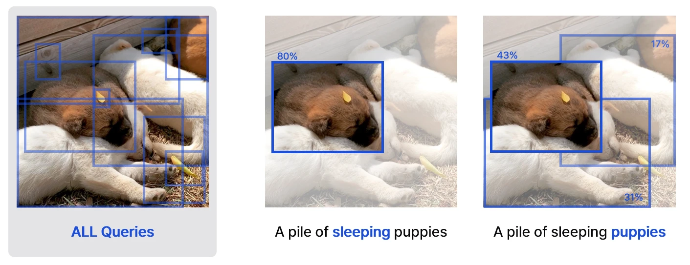 co-attention에서는 자신의 모달리티를 Query로, 다른 모달리티를 Key-Value로 사용해요. 예를 들어 Visual block은 강아지 이미지를 Query로 사용하고, Key와 Value로 “A pile of sleeping puppies”라는 문장을 사용해요. 이렇게 이미지 query와 문장 key의 관계를 파악해 서로 어떤 정보가 연결되어 있는지 학습해요. 마지막으로 value로 들어온 문장 “A pile of sleeping puppies”의 각 토큰이 이미지의 어떤 부분과 얼마나 관련 있는지 매핑해요.