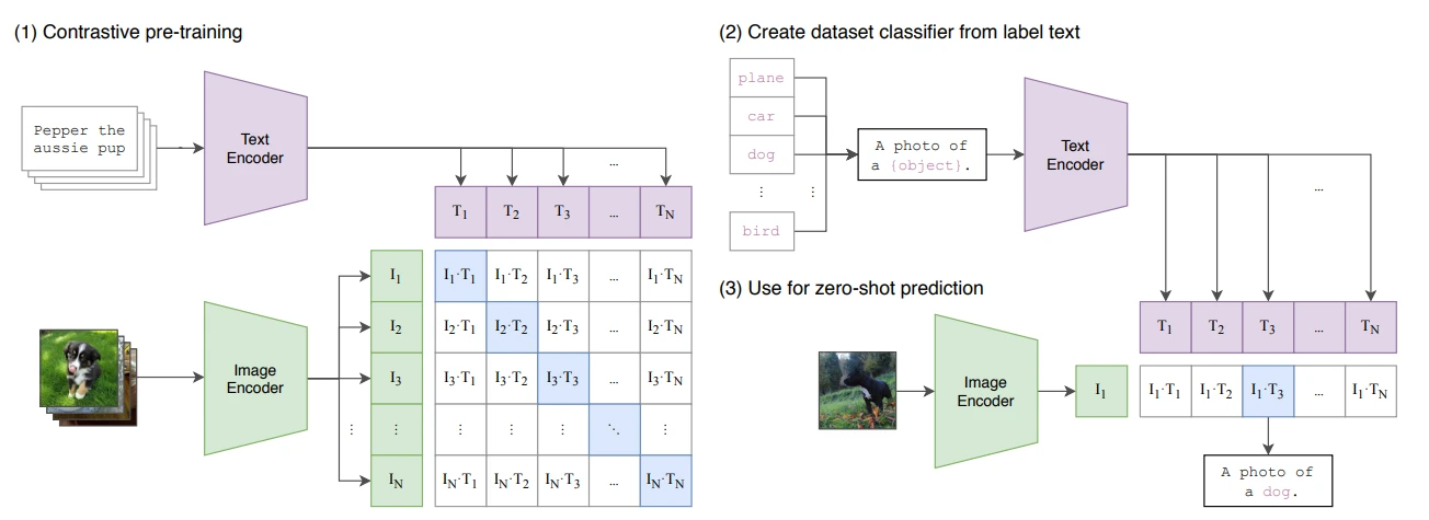 Contrastive Learning을 사용하는 가장 대표적인 예시가 CLIP이에요. 하나의 batch는 $N$개의 (image, text) pair로 구성돼요. 위에서 살펴본 Contrastive Loss를 이용해 이미지와 텍스트 임베딩 유사도가 높아지는 방향으로 이미지 인코더와 텍스트 인코더를 학습해요. 동시에 $N^2 - N$개의 negative pair와의 유사도는 작아지도록 학습해요.