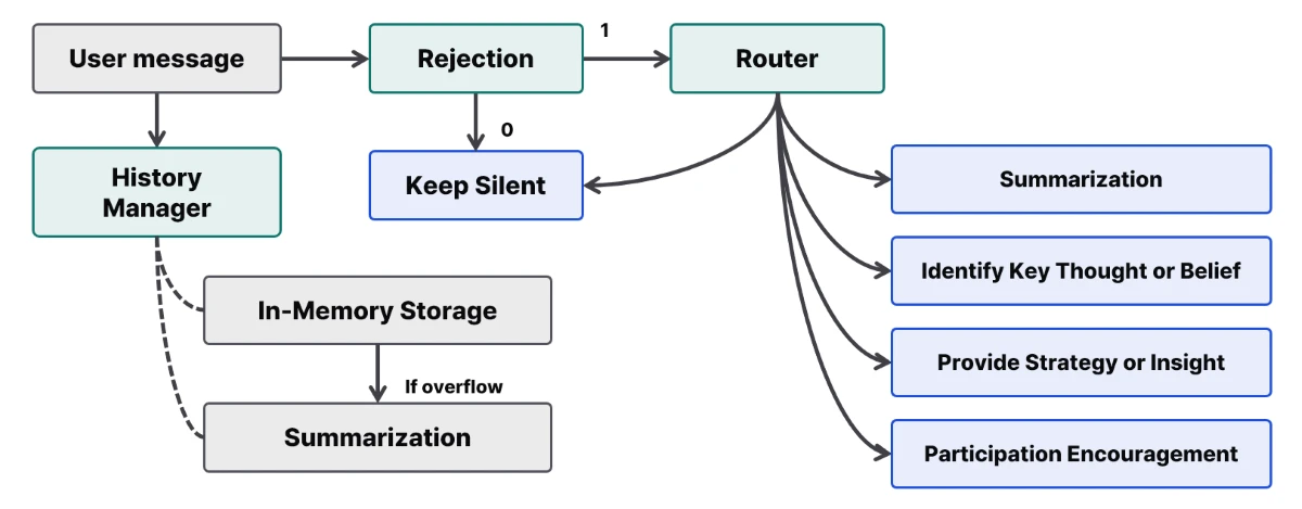 개입이 필요한 경우, 에이전트는 미리 정의된 4가지 행동 중 가장 적절한 행동을 결정해요. 에이전트 행동은 다음과 같이 정의돼요: (1) 대화 요약, (2) 핵심 사고와 신념 식별, (3) 전략 또는 통찰 제공, (4) 참여자 격려. 적절한 것이 없다고 판단되면 에이전트는 개입 없이 종료할 수 있어요.