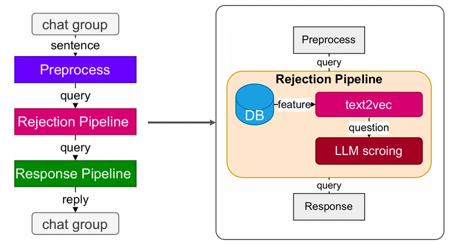 그렇다면 구체적으로 개입할 타이밍은 어떻게 정해야 할까요? HuixiangDou는 Text2Vec과 LLM scoring을 제안했어요. 이 시스템은 기술적인 대화를 나누는 그룹 채팅에 사용되며, 미리 기술에 관한 DB를 구축해 두었어요. 사용자 입력이 들어오면 먼저 DB에서 입력과 저장된 문장 간의 거리를 비교해요. 너무 멀리 있으면 무시해도 되는 대화로 판단하지만, 이 방식은 단어 선택에 매우 민감하게 반응해요. 예를 들어, “This development board is very good”와 “This board is poorly designed”는 높은 유사도를 가집니다. 이 문제를 해결하기 위해 추가로 LLM scoring을 거쳐 LLM이 해당 입력이 대답할 가치가 있는지 0-10 척도로 평가해요.