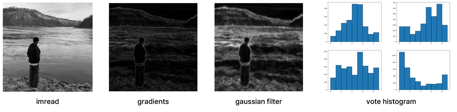 기본 HOG descriptor를 코드로 정리했어요. 각 단계의 결과를 시각화하면 다음과 같아요.
