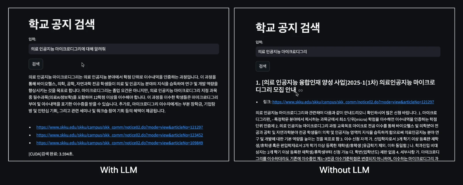 빠른 시연을 위해 Streamlit을 사용했어요. RTX 4060 위에서 임베딩 및 FAISS 검색을 처리했어요. 데모 영상 기준, 관련된 공지 3개를 찾는데 총 0.062초, LLM 요약까지 총 3.594초가 걸렸어요. 데모 영상에서 볼 수 있듯 필요한 정보를 잘 찾아왔어요.