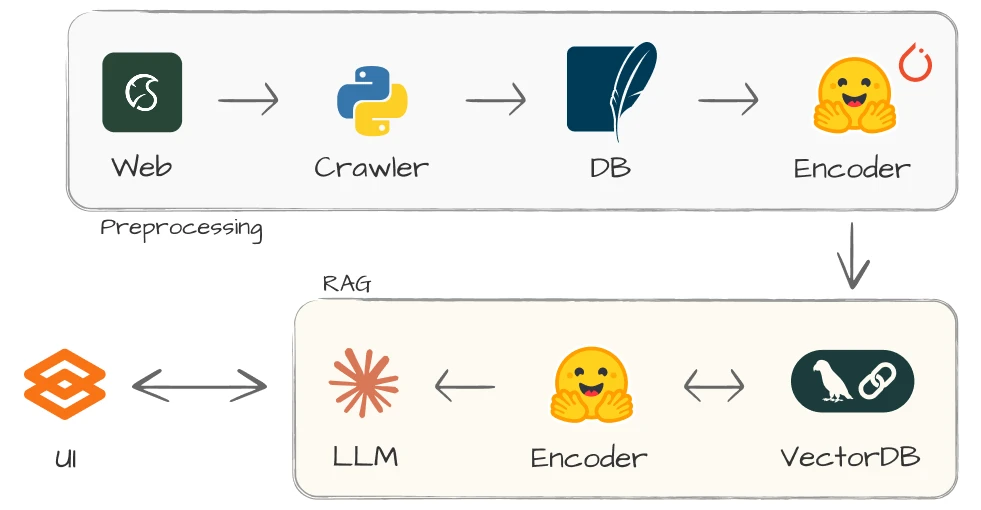 위쪽 파이프라인은 새로운 데이터를 수집하고 저장하는 과정이고, 아래쪽은 사용자가 공지를 검색하는 과정이에요.