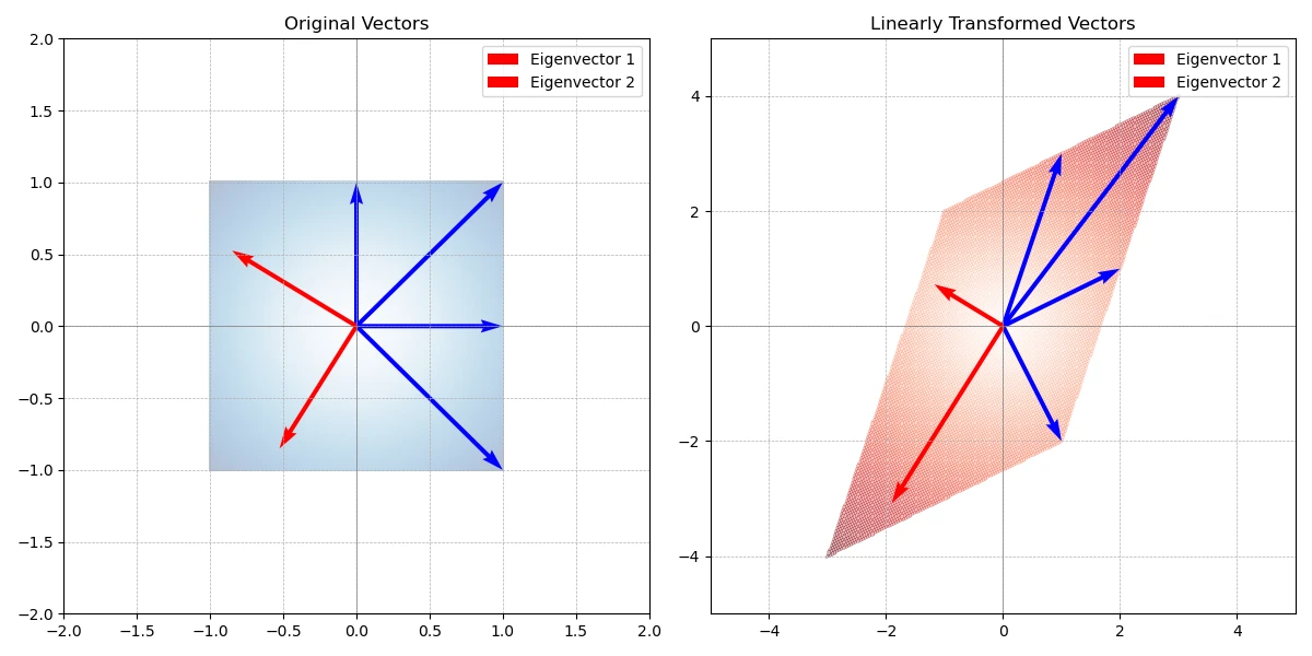 \[Av=\lambda v\]식만 봐서는 모르겠으니, 한 단계씩 해석해 보죠. $Av$는 벡터 $v$에 행렬 $A$를 곱해 선형 변환을 했어요. 이 과정에서 대부분의 벡터는 왜곡돼요.