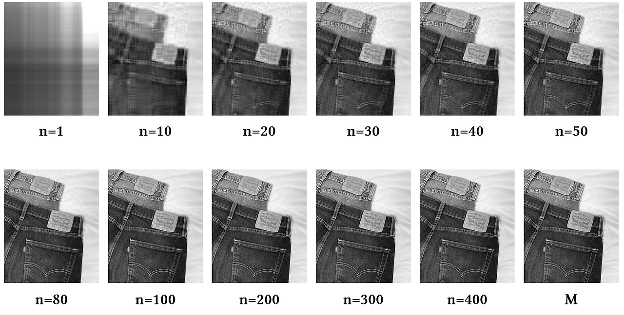 이미지 행렬 $M$은 $\sum_{n=1} \sigma_n u_n v_n^T$으로 표현할 수 있어요. 그런데 만약 정보를 전부 사용하지 않고 중요한 정보 몇 가지만 사용하면 어떨까요?