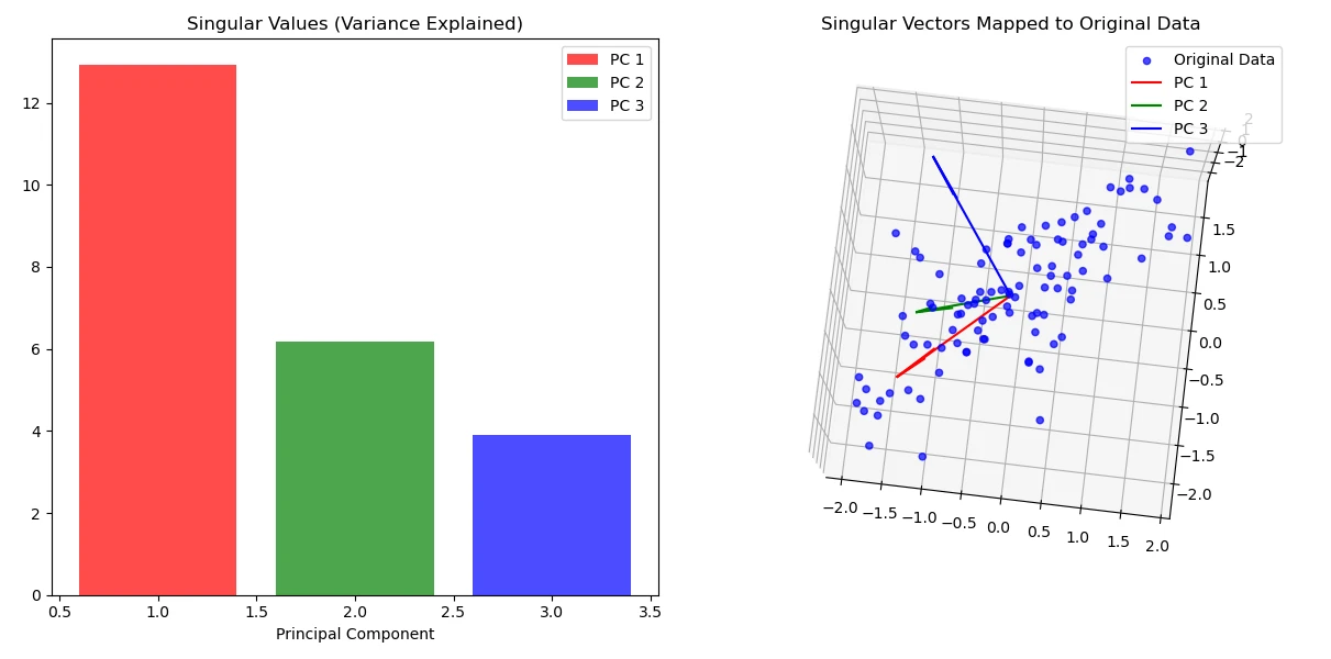 “중요한” 정보란 variance를 크게 높이는 값을 말해요. variance는 데이터가 얼마나 넓게 또는 복잡하게 퍼져있는가를 나타내죠. eigenvalue와 singular value는 scaling factor로 벡터를 얼마나 크게 늘릴지 결정하는 요소예요. 그렇기 때문에 큰 value는 vector를 넓게 퍼질 수 있도록 하고, 데이터 variance도 증가시켜요. 따라서 singular value가 큰 vector는 더 중요한 정보를 담고 있다고 표현할 수 있어요. 자세한 내용은 아래 PCA에서 다룰게요.