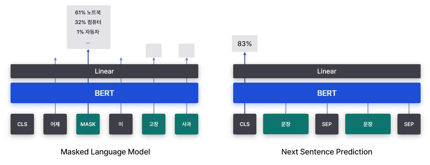 와 같은 특수 토큰을 사용한다. Attention block 전에 positional encoding을 통해 위치 정보를 주입한다. 단순히 단어 토큰 간 관계를 파악하는 것이 목적이지만, 이 경우 명확한 ground-truth 레이블을 매기기 힘들다. 따라서 BERT에서 했던 것과 마찬가지로 2개의 과제를 만들어 학습에 사용한다.