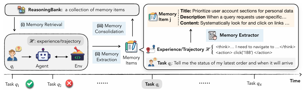 Google에서 제시한 ReasoningBank는 추상화된 전략을 찾아 기록하며, 성공했던 전략 뿐만 아니라 실패에서 얻을 수 있는 주요 전략도 함께 기억한다.